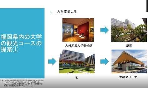 今学年度は、例年のように対面で開催することができず、Zoomを用いたオンライン開催となりましたが、青山学院大学、九州産業大学、共栄大学、実践女子大学、帝京大学の五校から計13チームのエントリーがあり、①観光まちづくり、②観光ビジネス、③with・afterコロナ下の観光の3つのテーマで学生たちによるプレゼンテーションが実施されました。